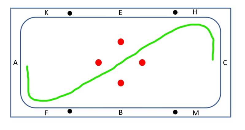 Durch die Länge der Bahn, dabei zuerst um 2 Pylonen eine Acht und weiterleiten. Dann das Gleiche, nur alle 4 Pylonen mit einbauen